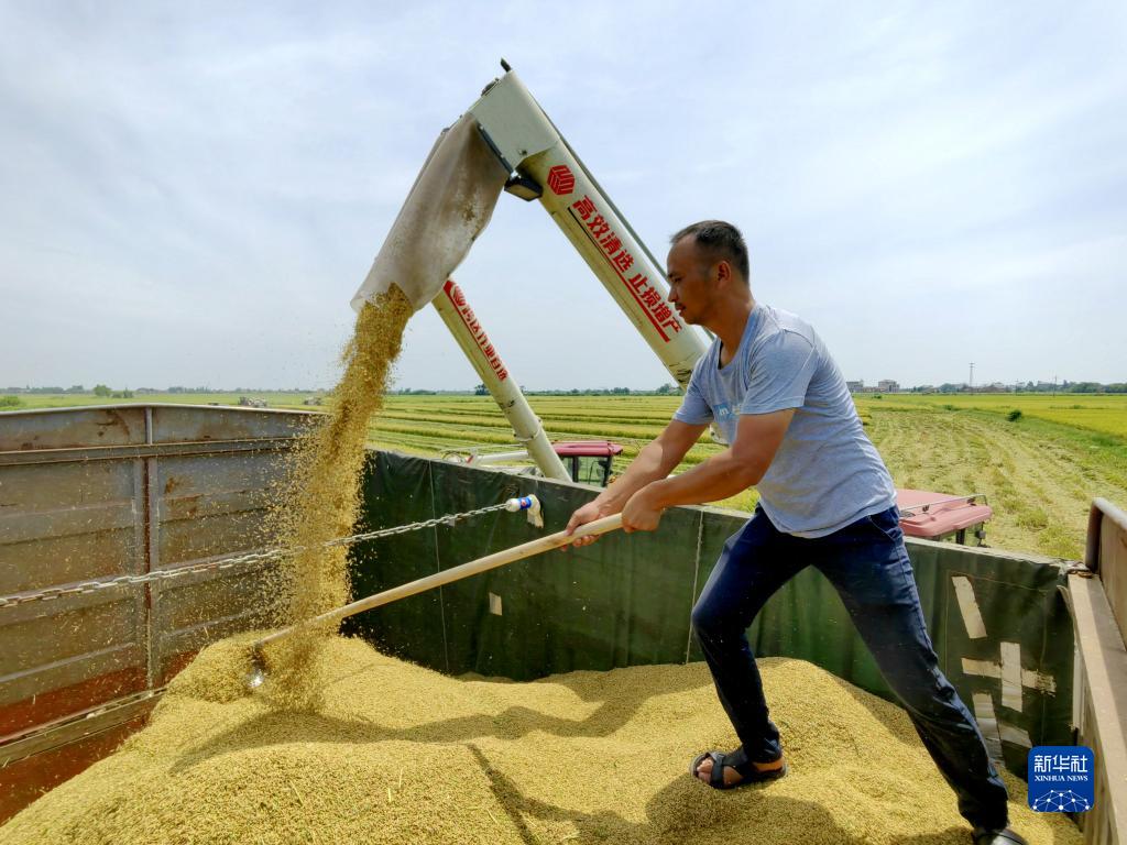 在江西省南昌縣塘南鎮北聯(lián)村,收割機將稻谷轉運至裝谷車(chē)內(7月13日攝)。