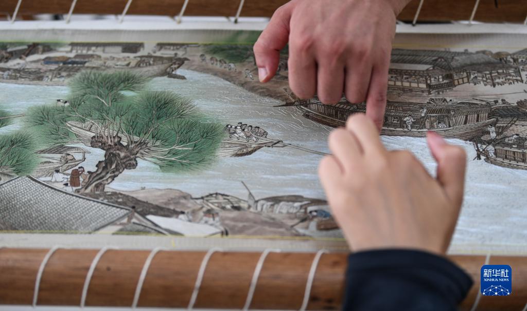 7月14日,游客在開(kāi)封博物館觀(guān)賞汴繡作品。