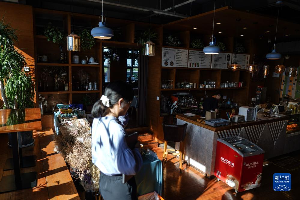 7月14日,隨著(zhù)一名工作人員走進(jìn)咖啡館,園區室內燈光根據動(dòng)態(tài)智能調節亮度。