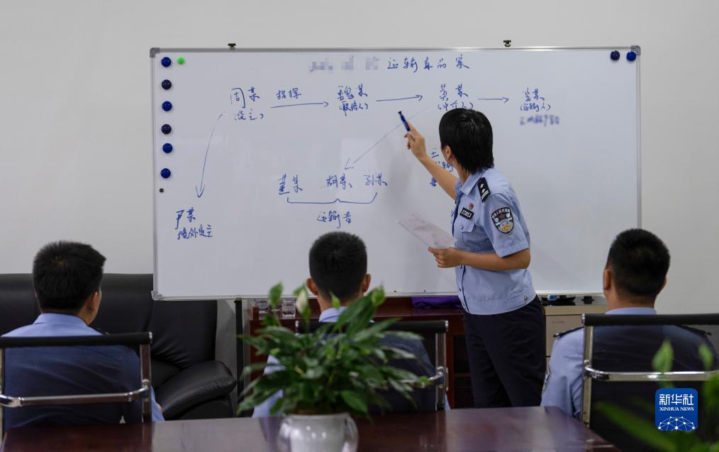 7月13日,尹銘燕(右二)和同事在模擬進(jìn)行案情分析和推演。
