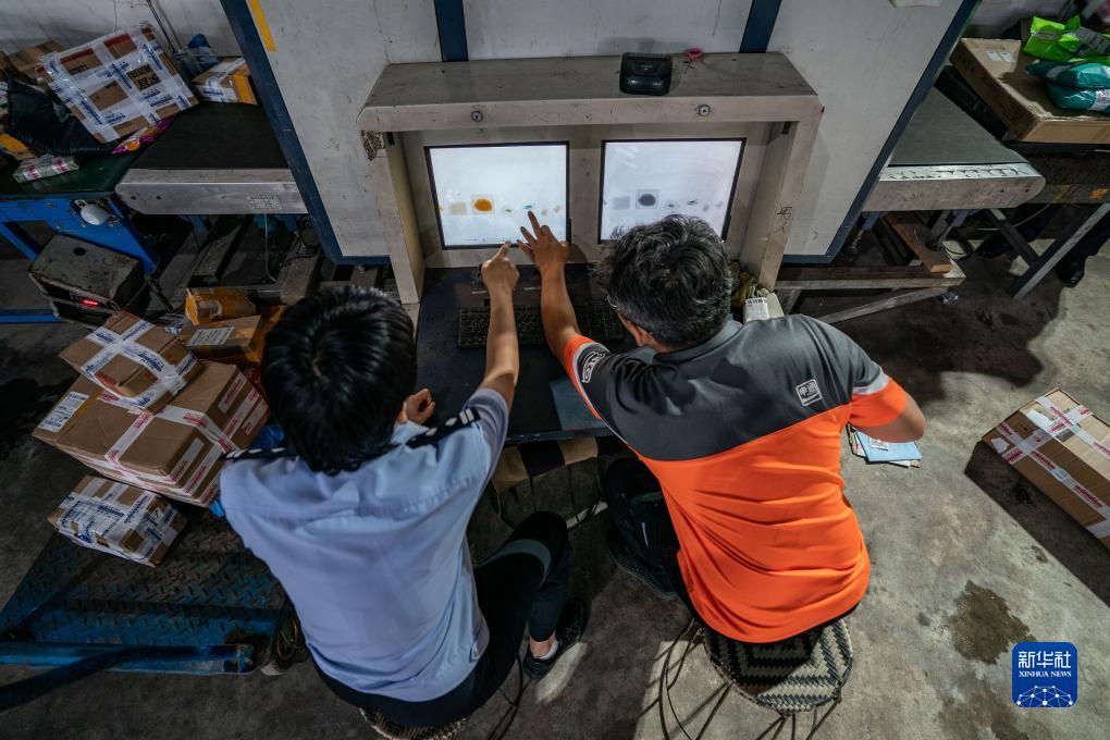 7月12日,尹銘燕在芒市一處物流點(diǎn)對快遞包裹進(jìn)行查緝。