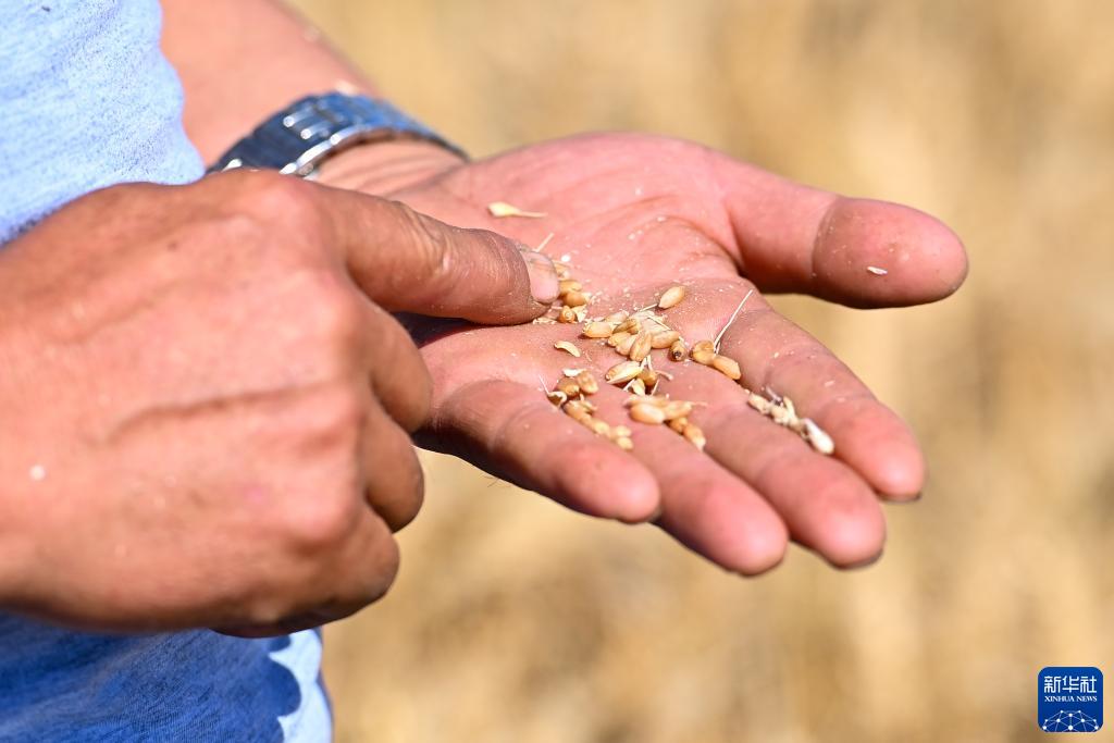 新疆呼圖壁縣五工臺鎮小泉村的糧農查看收獲的小麥(7月15日攝)。