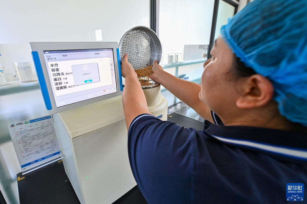 新疆呼圖壁縣一家糧食收購企業(yè)的工作人員對交售的小麥進(jìn)行檢測(7月15日攝)。