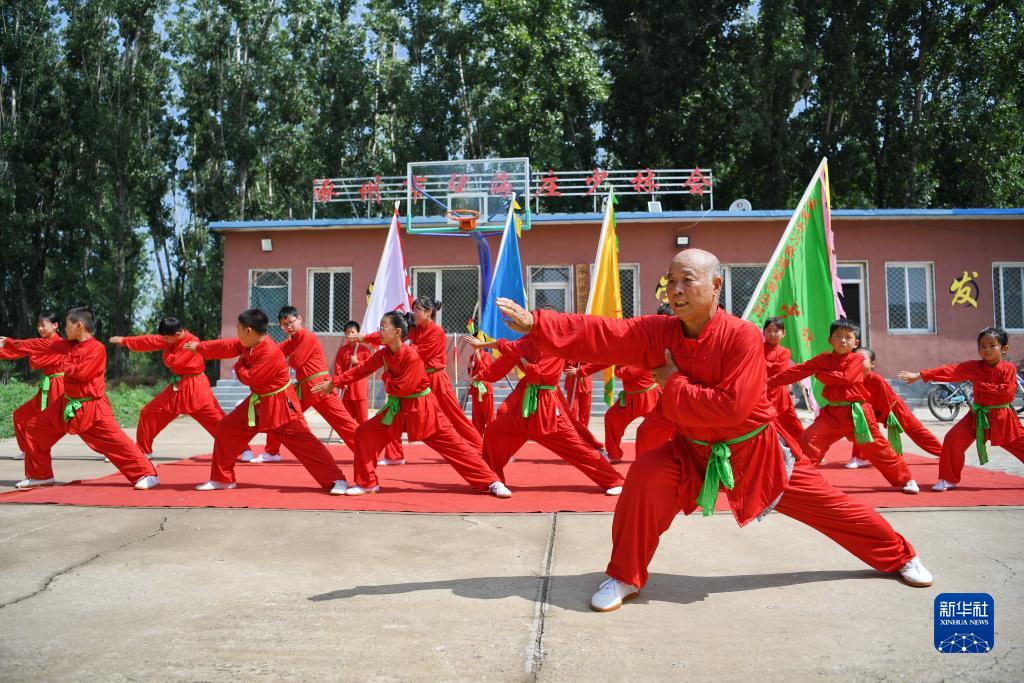7月16日,傳統武術(shù)望海莊少林會(huì )非遺傳承人楊守培(前)在河北省涿州市刁窩鎮望海莊村指導學(xué)生練習武術(shù)動(dòng)作。