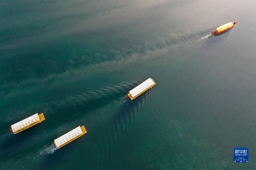 7月16日清晨,游客乘坐“竹筏”造型電動(dòng)游船,在建德新安江的江霧中前行(無(wú)人機照片)。