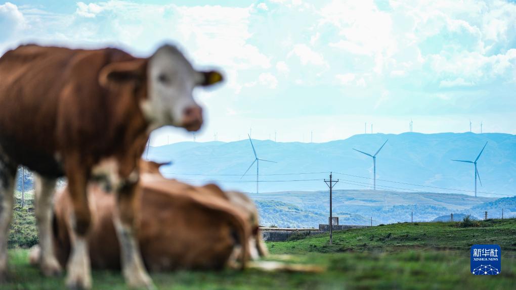 威寧彝族回族苗族自治縣雪山鎮村民養的牛在風(fēng)力發(fā)電設備下的草場(chǎng)休憩(7月13日攝)。