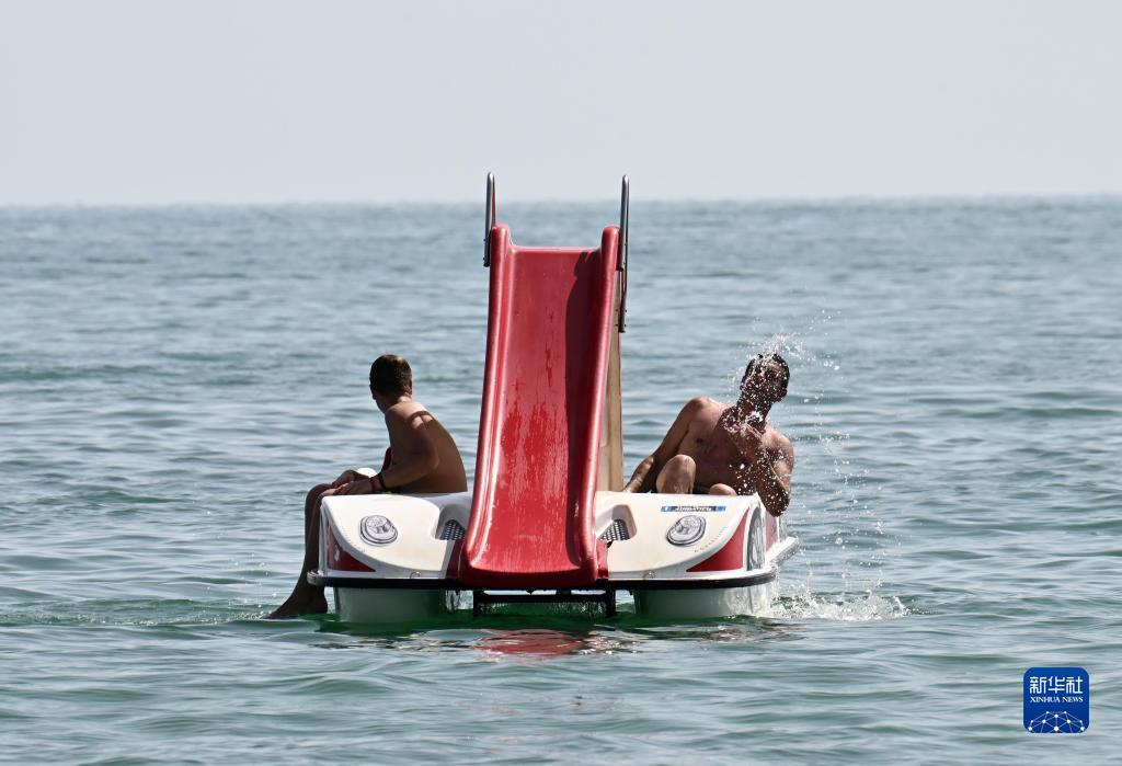 7月16日,在意大利拉迪斯波利,人們在海中嬉戲。