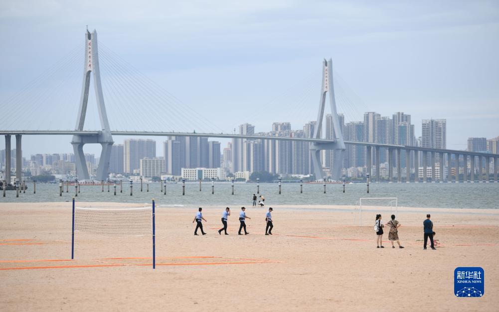 7月17日,在廣東湛江五環(huán)廣場(chǎng)的沙灘上,公安民警在執勤巡邏。