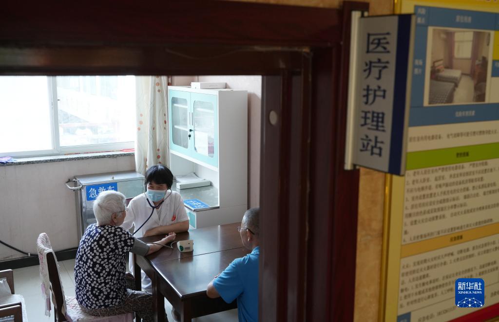 7月17日,在正定縣塔元莊村勁松老年公寓,工作人員在醫療護理站給老人檢查身體。