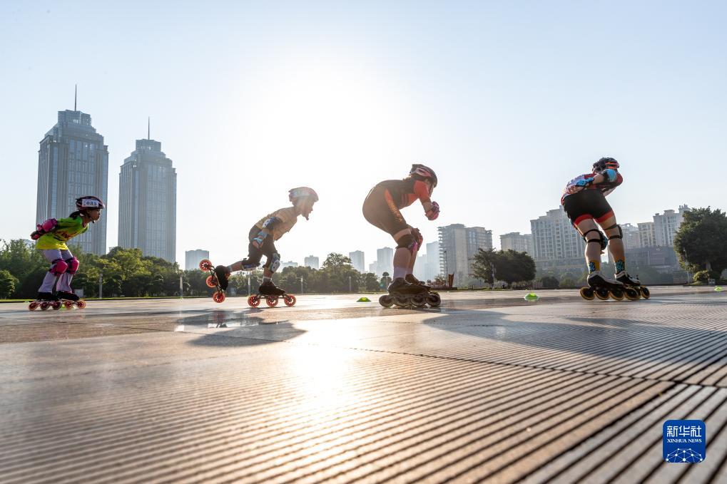 7月17日,孩子們在重慶市南川區市民廣場(chǎng)練習輪滑。