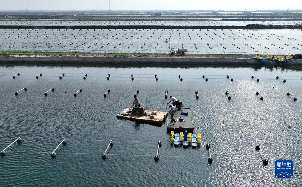7月17日,河北省樂(lè )亭縣姜各莊鎮第二節村村民在海產(chǎn)品養殖基地的海參養殖池安裝增氧設備(無(wú)人機照片)。