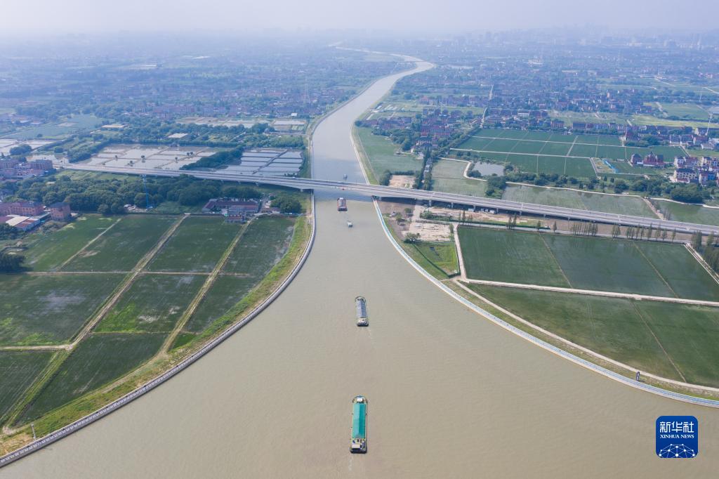 7月18日,首批通航貨船進(jìn)入京杭運河杭州段二通道駛往錢(qián)塘江(無(wú)人機照片)。