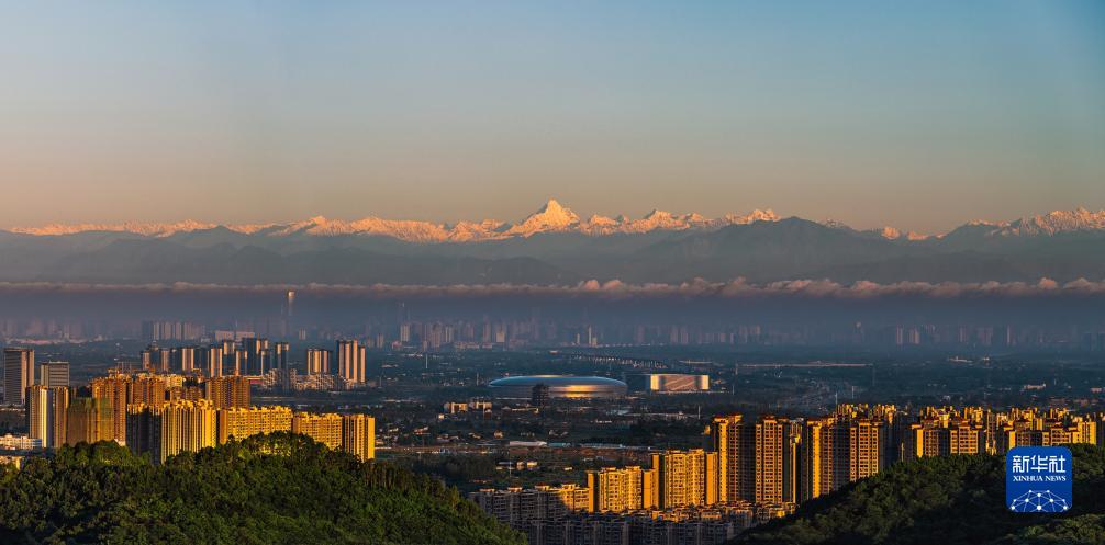 這是2021年6月4日清晨拍攝的成都市建筑群與遠處的雪山。