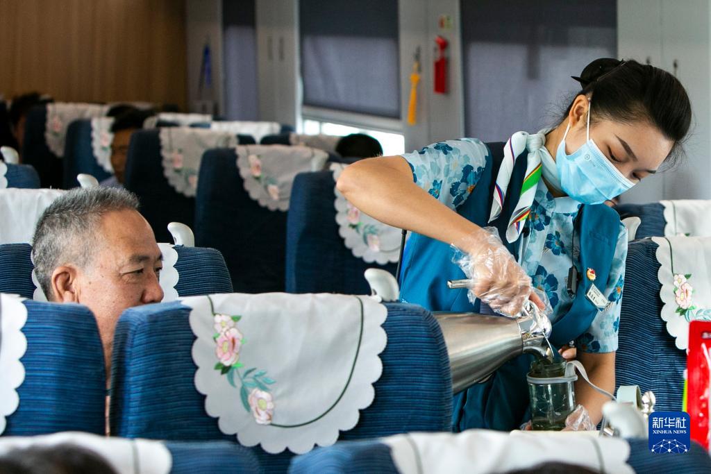 依波逢(右)在D887次列車(chē)上為旅客倒水(7月16日攝)。