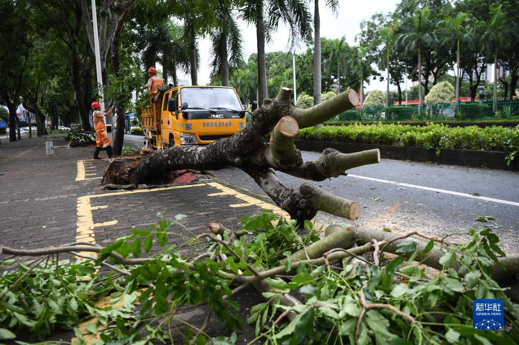 7月18日,在廣東湛江市椹川大道北,市政人員在清理倒伏樹(shù)木。