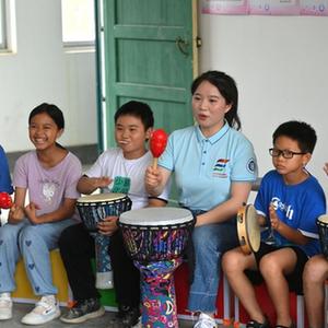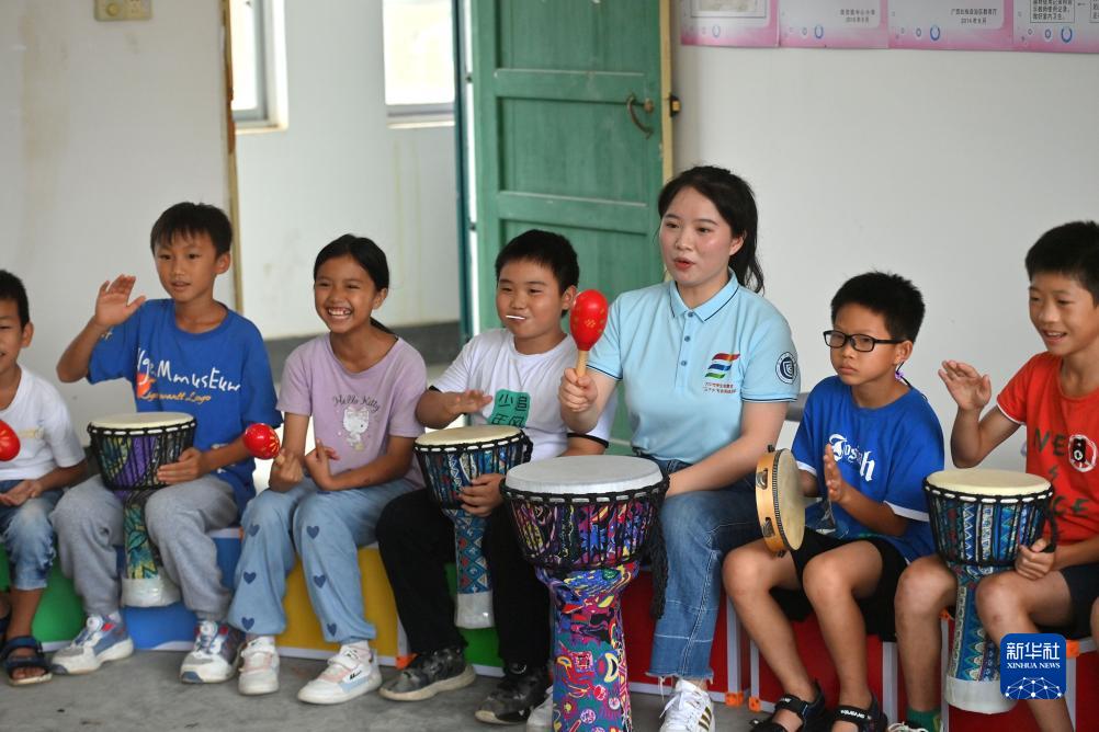7月18日,在柳州市融安縣泗頂鎮中心小學(xué),大學(xué)生在音樂(lè )課堂上給小學(xué)生上課。
