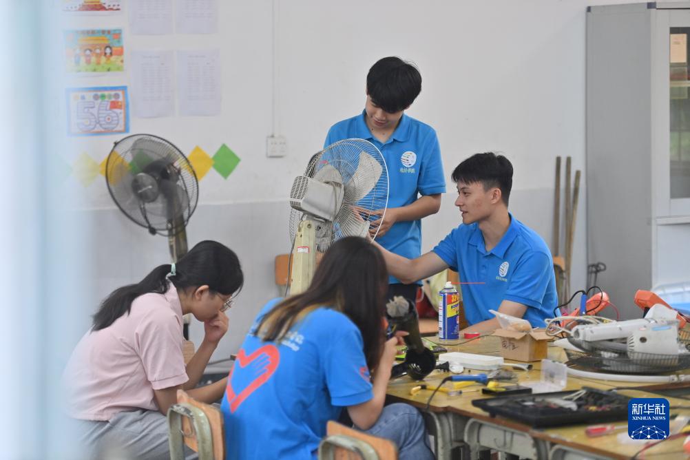 7月18日,在柳州市融安縣泗頂鎮中心小學(xué),大學(xué)生給附近村民維修家電。