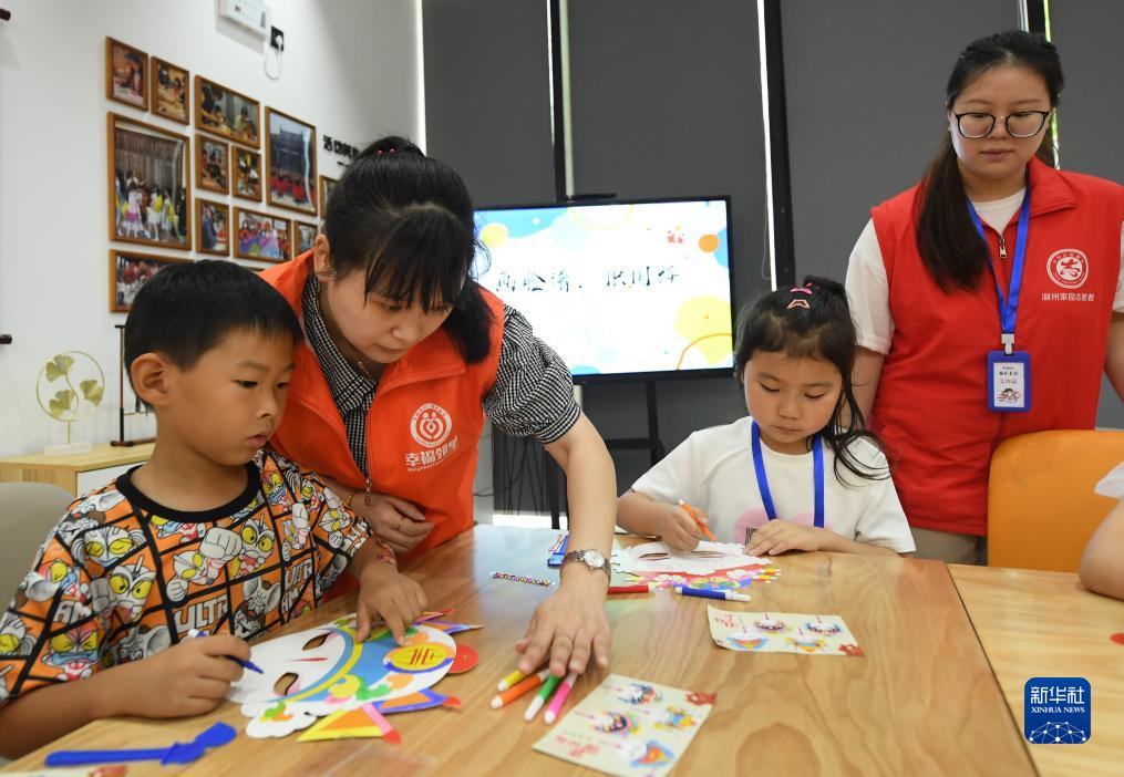 7月19日,在湖州市吳興區愛(ài)山街道,幸福鄰里志愿者帶領(lǐng)孩子們做手工。