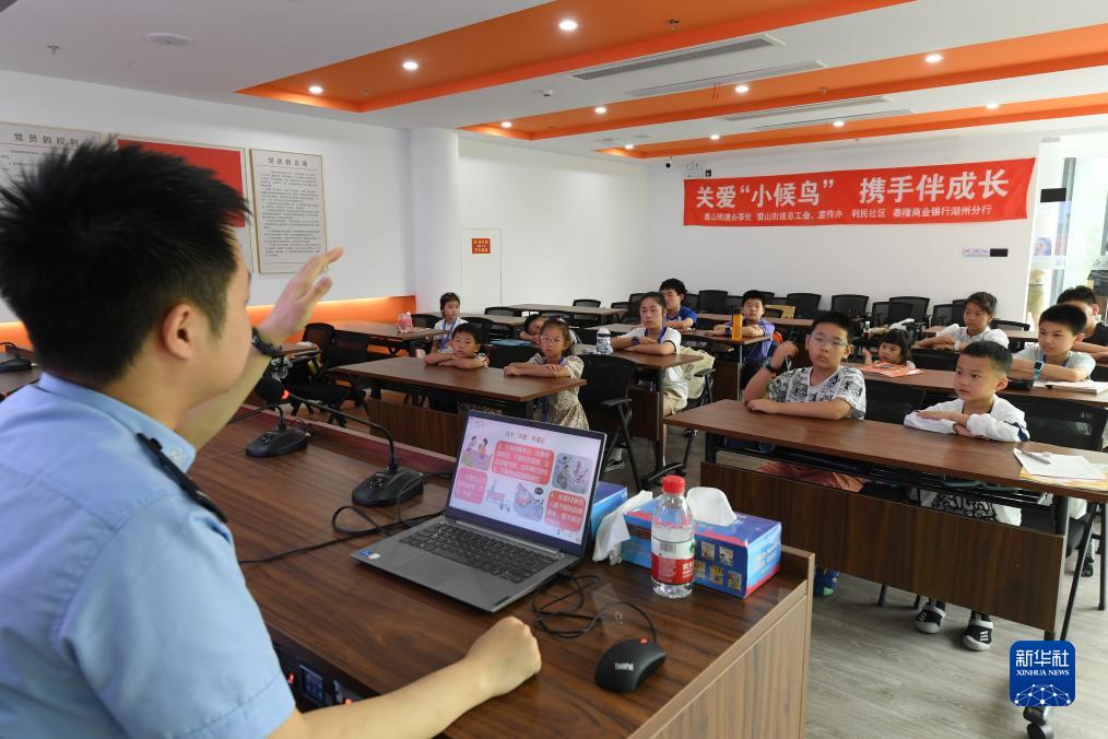 7月19日,在湖州市吳興區愛(ài)山街道,吳興區公安分局的民警給孩子們講授暑期安全防范知識。
