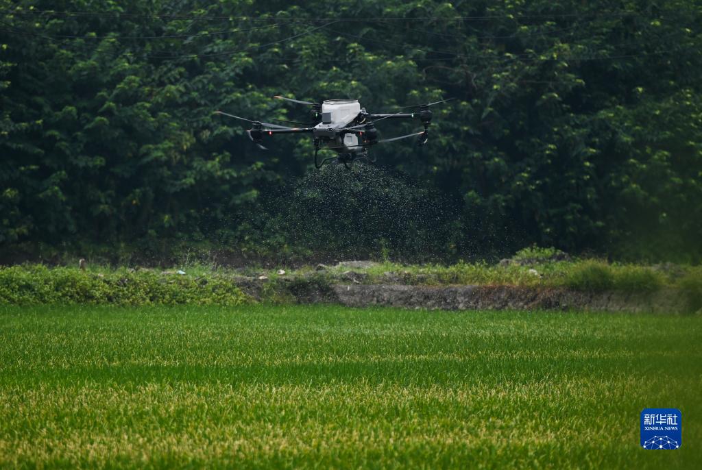 7月19日,在湖州市東林鎮保永村,種糧大戶(hù)操縱植保無(wú)人機為稻田施肥。