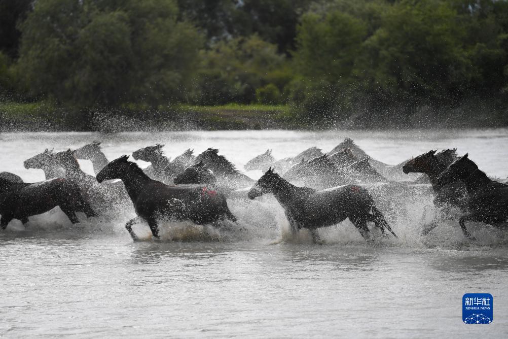 這是7月17日在新疆伊犁哈薩克自治州昭蘇縣濕地公園景區拍攝的“天馬浴河”景觀(guān)(無(wú)人機照片)。