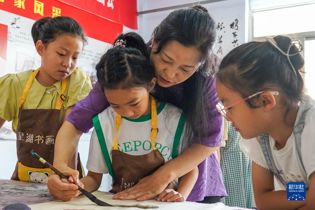 7月19日,在無(wú)棣縣棣豐街道星湖社區服務(wù)中心,志愿者教孩子們繪畫(huà)。