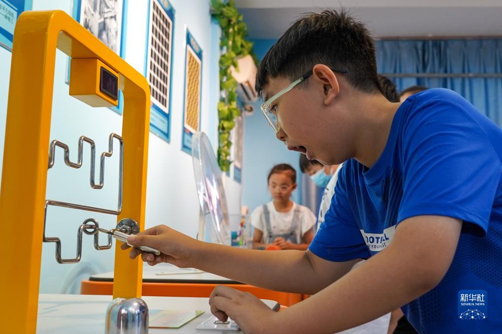 7月19日,在無(wú)棣縣棣豐街道星湖社區服務(wù)中心,孩子們體驗科學(xué)游戲。
