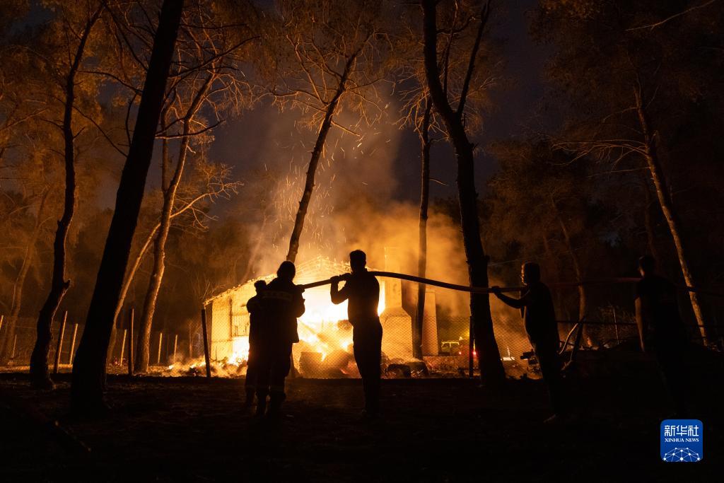 7月18日,在希臘雅典郊外的曼茲拉附近,消防員和志愿者進(jìn)行滅火作業(yè)。