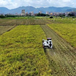 在福建省福州市長(cháng)樂(lè )區古槐鎮洋下村春欽農業(yè)專(zhuān)業(yè)合作社稻田,農民駕駛農機收割早稻(7月19日攝,無(wú)人機照片)。