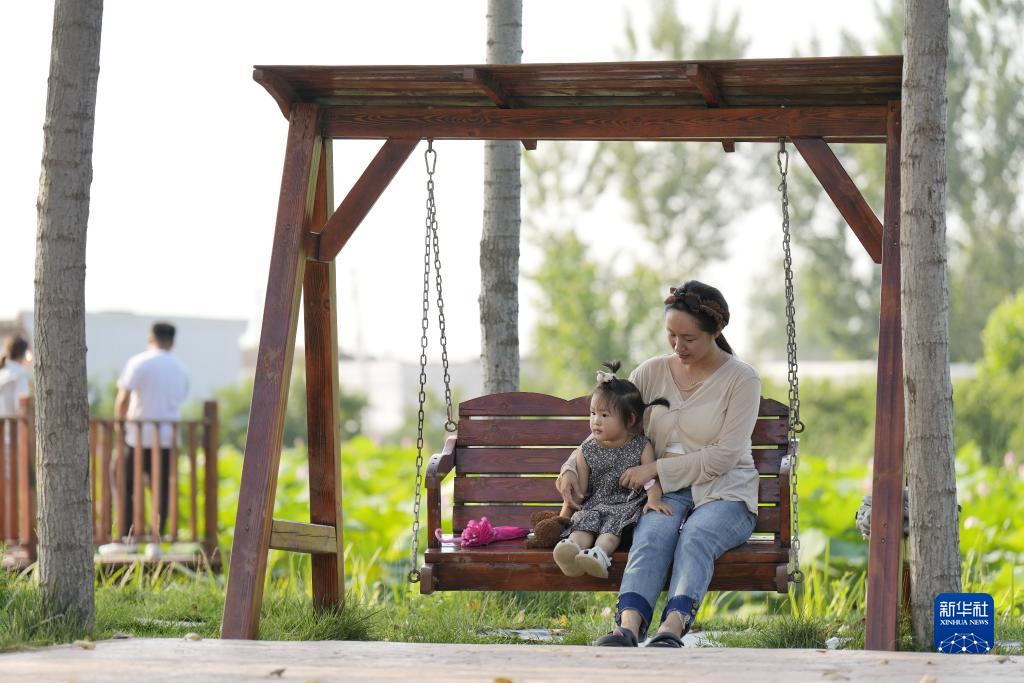7月19日,村民在河北省唐山市豐南區北孫莊村一處水上游園內休閑。
