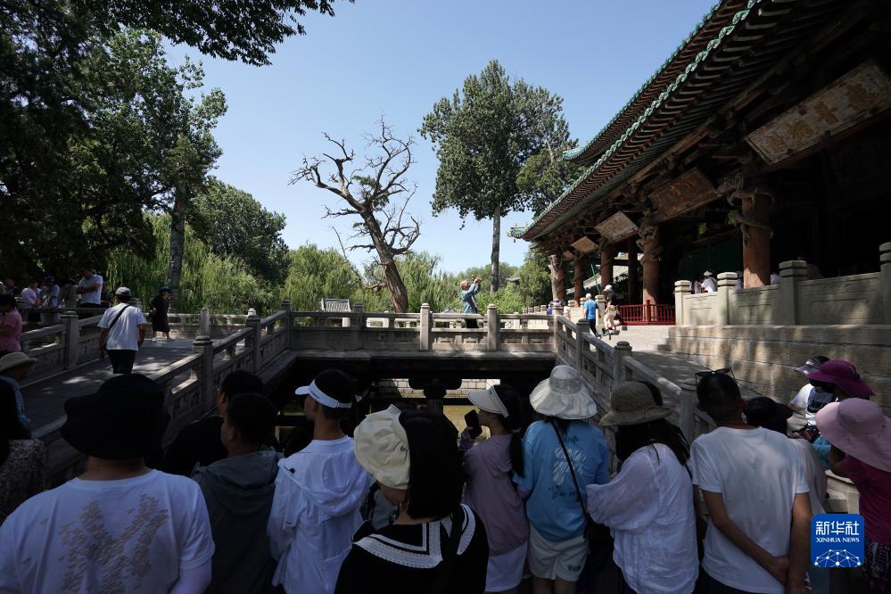 游客在晉祠圣母殿前觀(guān)看十字形古橋魚(yú)沼飛梁(7月4日攝)。