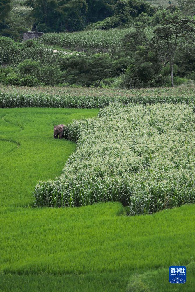 在云南省普洱市江城縣,一頭亞洲象在稻田中覓食(7月19日攝)。