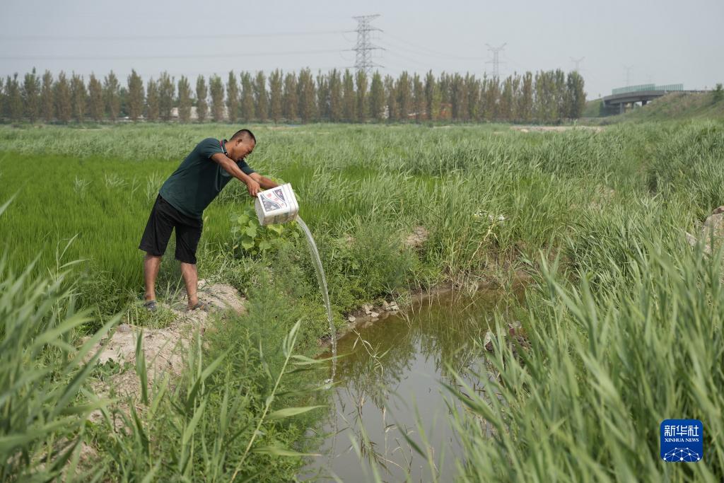 7月20日,河北省唐山市豐南區黑沿子鎮,工作人員在一處由鹽堿地改良而成的稻漁綜合種養試點(diǎn)區內投放蝦苗。