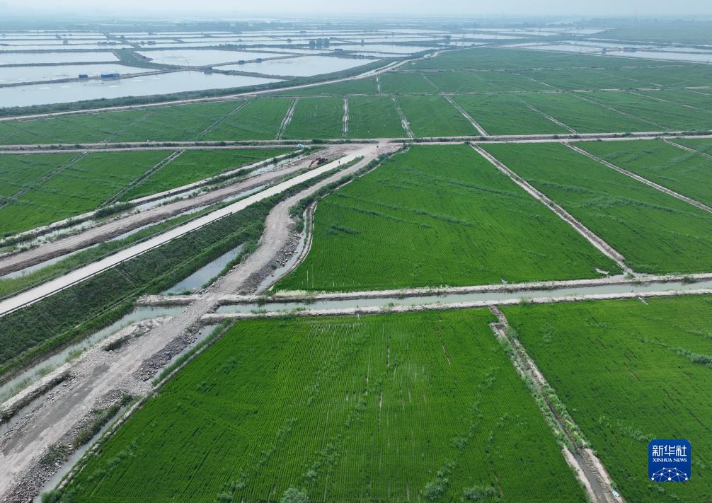 河北省唐山市豐南區黑沿子鎮由鹽堿地改良而成的水稻田(7月20日攝,無(wú)人機照片)。