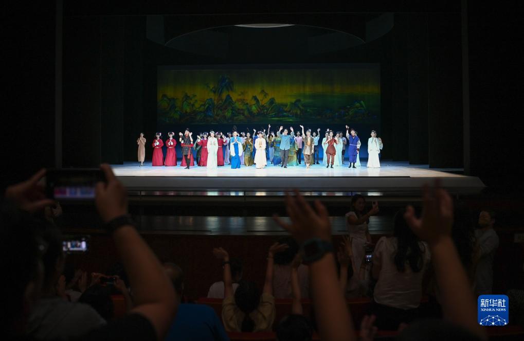 7月20日,中國東方演藝集團演員在烏魯木齊文化中心大劇院表演舞蹈詩(shī)劇《只此青綠》。謝幕后,觀(guān)眾拍照留念。