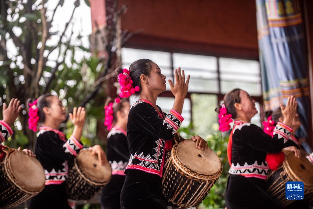 瀾滄縣東回鎮班利村村民表演拉祜族舞蹈(7月20日攝)。