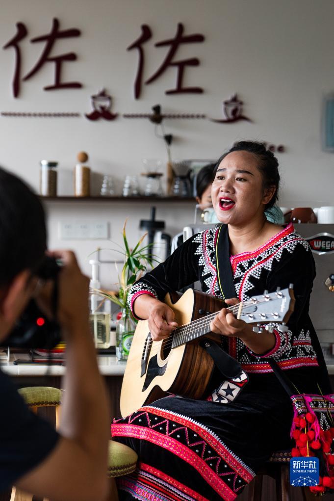 瀾滄縣東回鎮班利村村民郭玉蘭演唱原創(chuàng )歌曲(7月20日攝)。