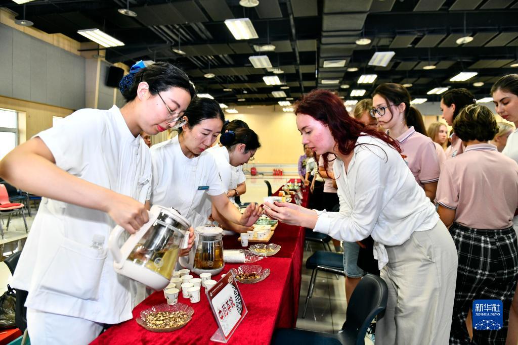 7月20日,在中國石油大學(xué)(華東)沉浸式中醫藥文化體驗中心,黃島區中醫醫院的醫護人員為留學(xué)生倒上中藥茶飲。