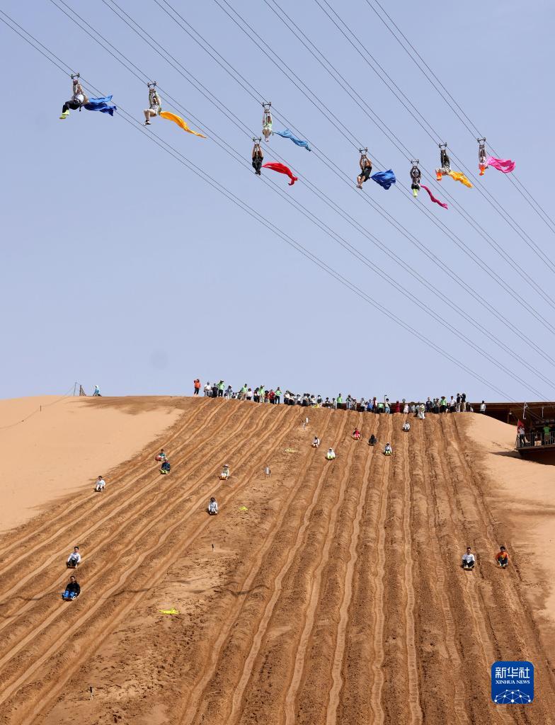 7月20日,游客在寧夏中衛市沙坡頭景區體驗飛渡黃河、滑沙。