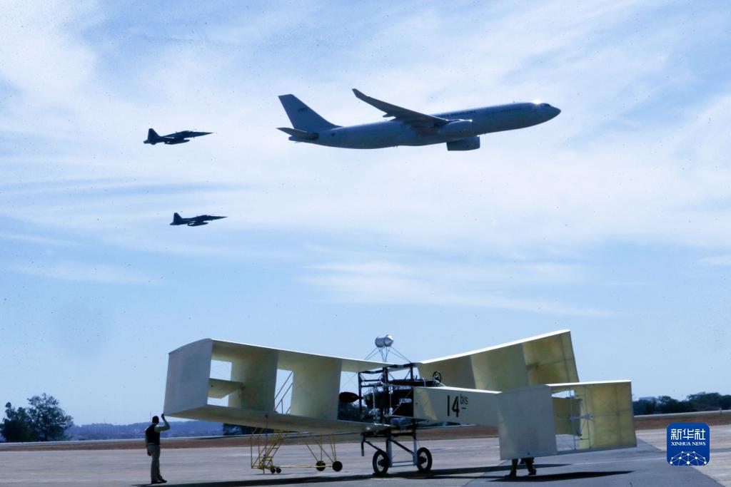 7月20日,巴西空軍飛機在巴西首都巴西利亞舉行的杜蒙特誕辰150周年紀念儀式上進(jìn)行飛行表演,地面停放的是杜蒙特設計的“14bis”飛行器復制模型。