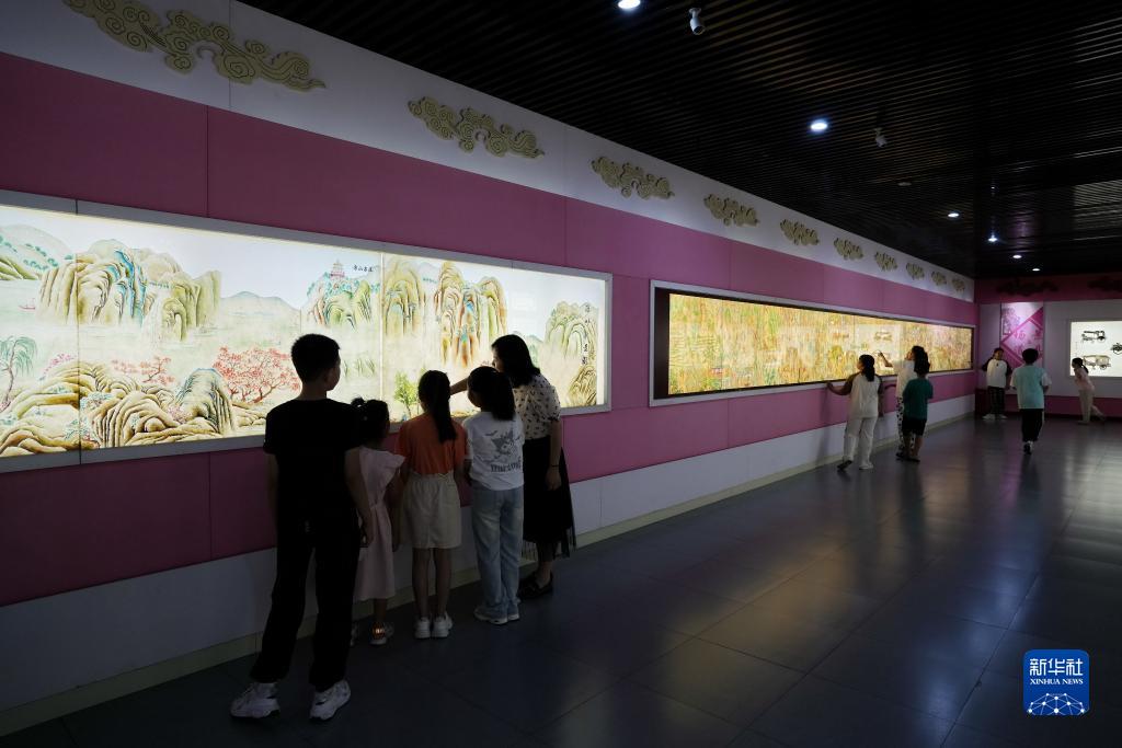 7月21日,孩子們在中國灤州皮影博物館內參觀(guān)皮影長(cháng)卷。
