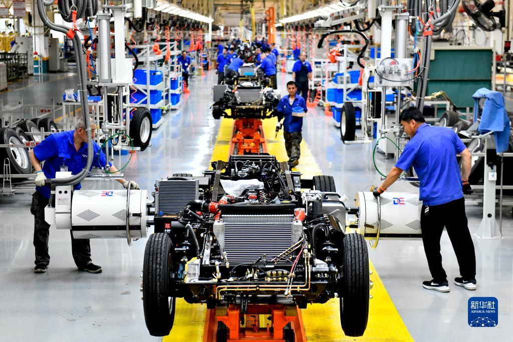 7月21日,在位于威海市文登區的濰柴新能源商用車(chē)有限公司,工人在生產(chǎn)線(xiàn)上裝配汽車(chē)。