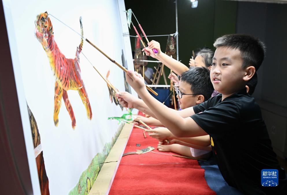 7月21日,小朋友在河北省石家莊市橋西區冀臺聯(lián)文化產(chǎn)業(yè)園體驗皮影戲表演。