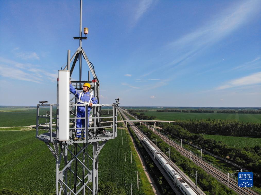 7月13日,位于肇東市的哈齊高鐵12號基站鐵路通信鐵塔上,魏巍進(jìn)行維護鐵路通信設備作業(yè)(無(wú)人機照片)。