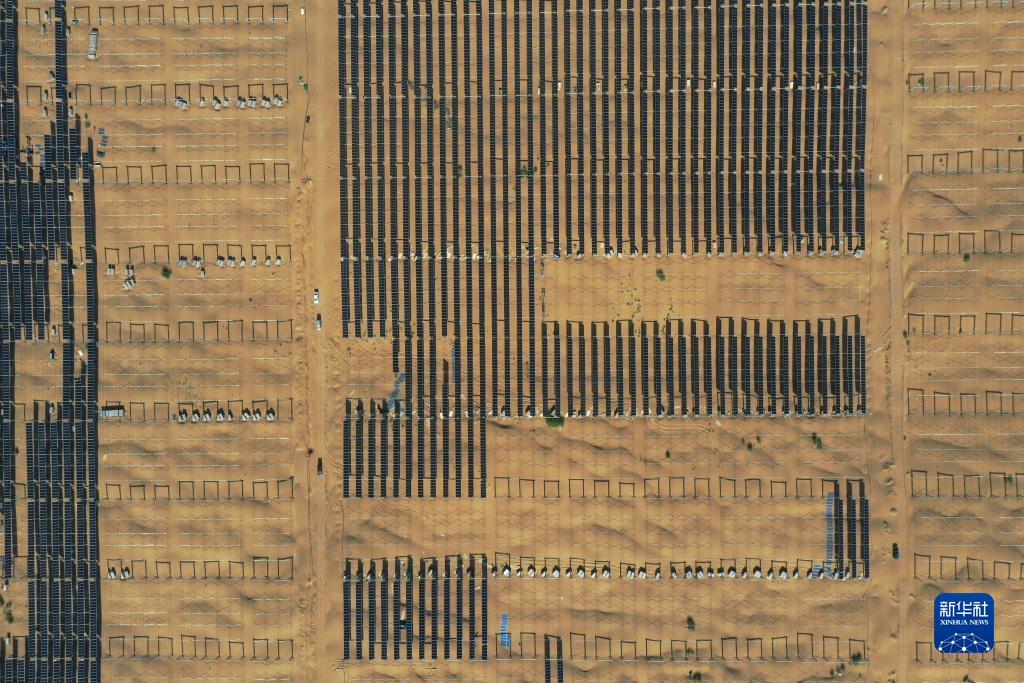 蒙西基地庫布其200萬(wàn)千瓦光伏治沙項目的施工現場(chǎng)(7月22日攝,無(wú)人機照片)。