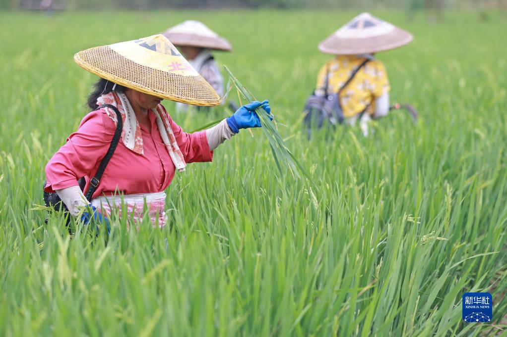 7月22日,在貴州省黔東南苗族侗族自治州岑鞏縣水尾鎮馬家寨村雜交水稻制種基地,村民管護水稻。