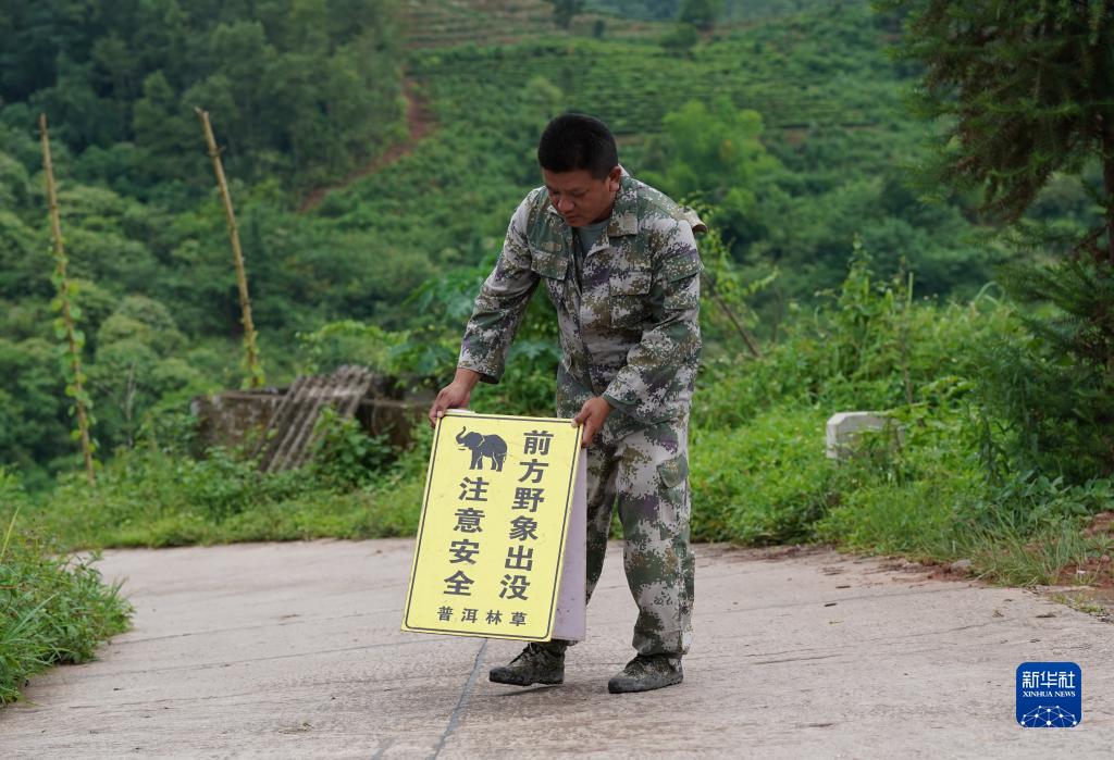 一名監測員在野象活動(dòng)區域一處道路上設置警示牌(7月19日攝)。