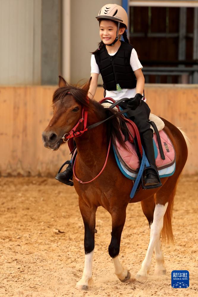 7月22日,在山東省棗莊市一家馬術(shù)俱樂(lè )部,小學(xué)生騎馬參加“盛裝舞步”比賽。
