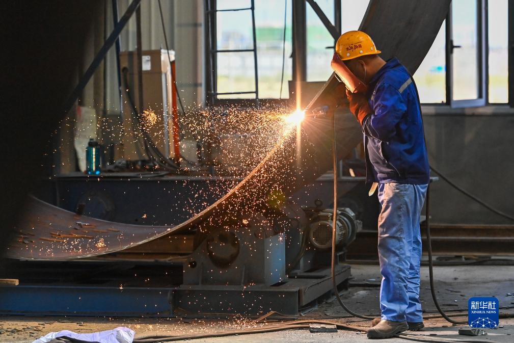 在新疆塔城重點(diǎn)開(kāi)發(fā)開(kāi)放試驗區先行發(fā)展區中國水利水電第四工程局有限公司塔城分公司,工人在打磨風(fēng)機塔筒(7月22日攝)。