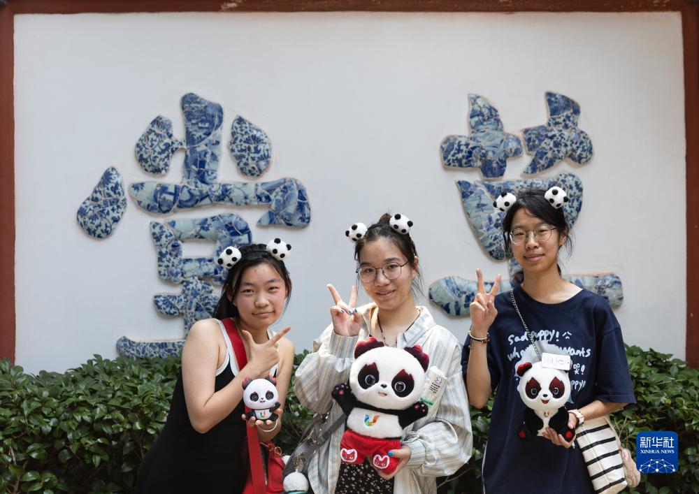7月19日,三名來(lái)自河北的游客手捧成都大運會(huì )吉祥物“蓉寶”在杜甫草堂景點(diǎn)之一的花徑留影。